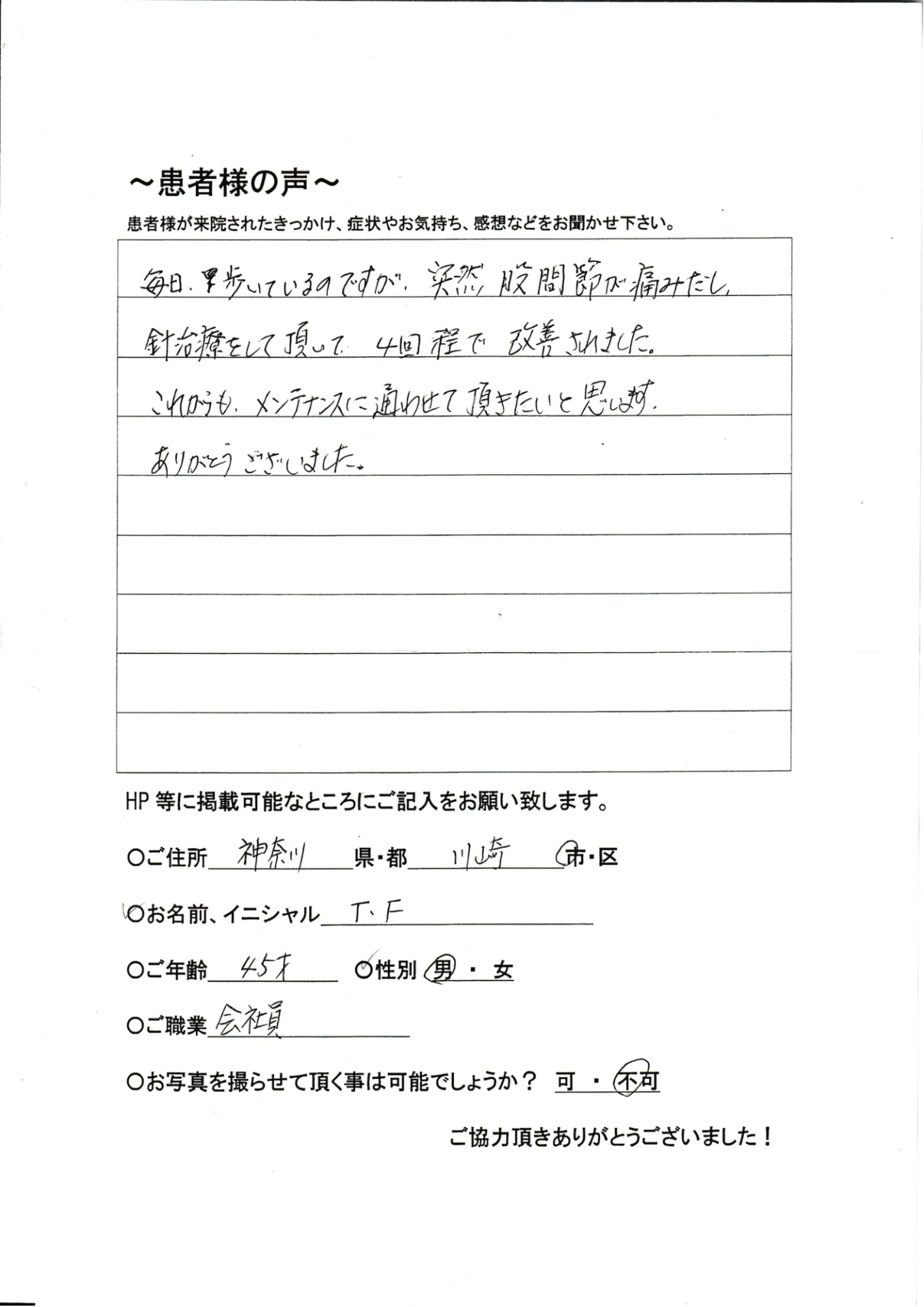 毎日、歩いているのですが、突然股関節が痛みだし、針治療をして頂いて4回程で改善されました。